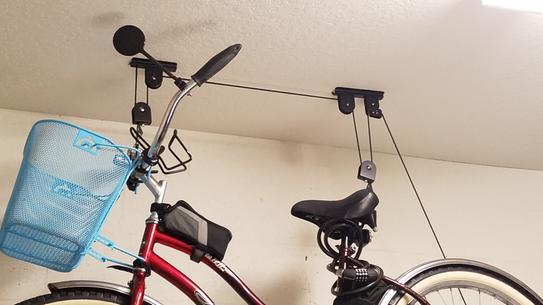 Raise and lower a 50lb bike up to 12 feet by simply latching the hooks to the seat and handlebars and pulling the rope.